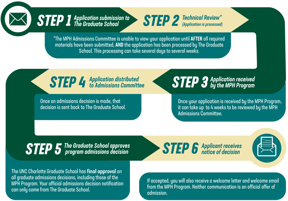 Applications submitted after the MPH program regular decision deadline, and prior to the university application deadline, will be periodically reviewed, subject to space limitations. It is recommended that applicants applying after the regular decision deadline should reach out to the program via email (mphprogram@charlotte.edu) to determine if applications are still being accepted by the program.